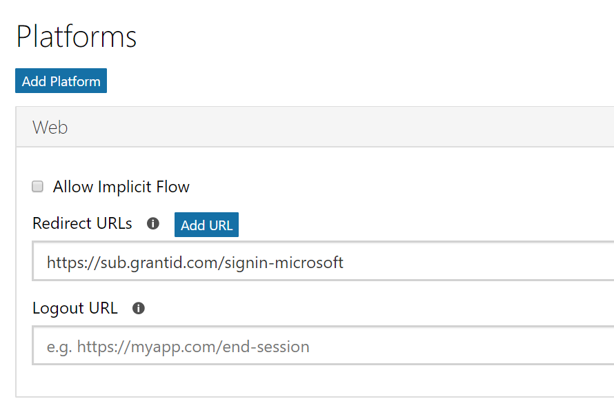 A new panel named Web will be created under the Platforms section. The Redirect URL is available in the Microsoft panel of the Banco Internacional EC ID External Provider's page.
