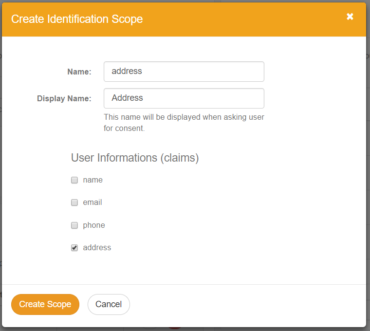 An Identity Scope has a name, display name and a set of claims. Banco Internacional EC ID provides a couple of default scopes that include basic user claims: